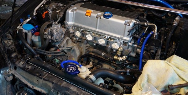 Чтобы убрать подогрев коллектора, нужно было отпилить часть коллектора в которой находился канал антифриза для клапана холостого хода и какой то технологический канал, который как мне сказали можно смело заглушить на моторах К24. Для начала сливаем антифриз, краник внизу радиатора. Затем снимаем дроссель и впускной коллектор, он у нас разборный и состоит из 2-х частей, для тех кто не в курсе).