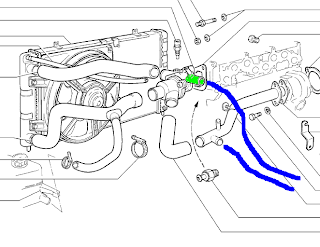 На картинке приведена система охлаждения, синим подрисованы шланги печки. Видно (а на машине видно еще лучше), что радиатор печки в принципе не может быть слит через отверстия отверстия в блоке цилиндров и в радиаторе, так как находится ниже мест соединения шлангов с остальной системой охлаждения.